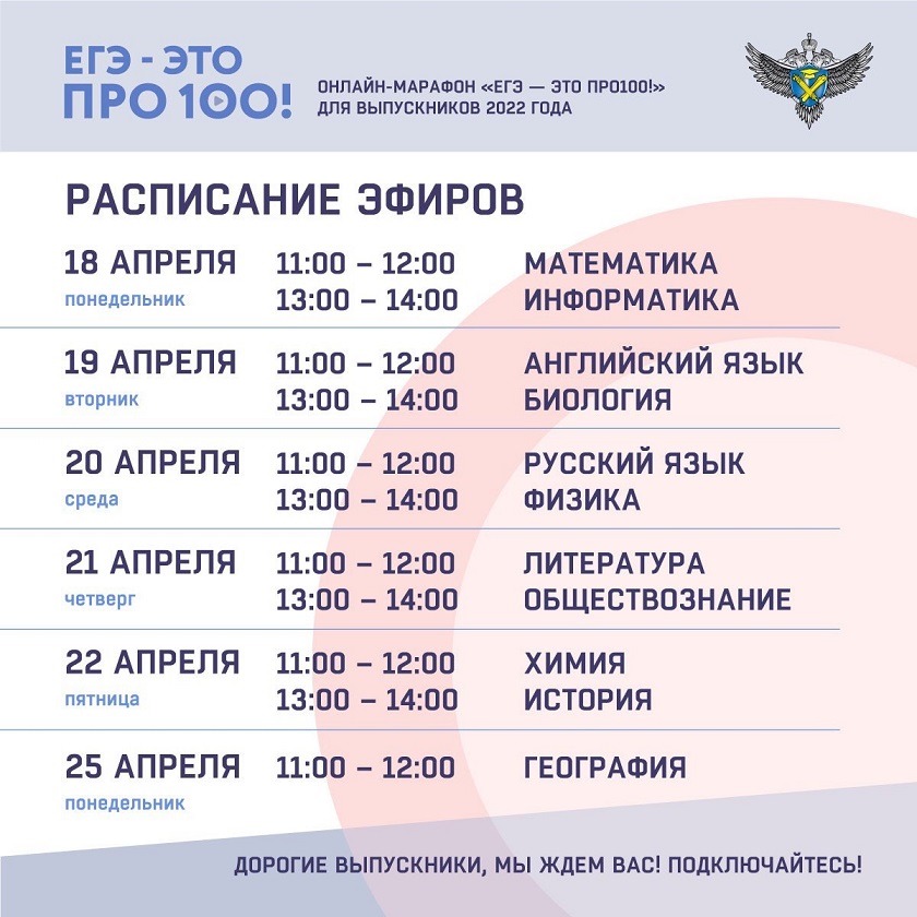 Отдел образования Администрации Мартыновского района информирует о проведении Федеральной службой по надзору в сфере образования и науки (далее – Рособрнадзор) серии онлайн-мероприятий в рамках проекта «ЕГЭ – это про100!» (далее – мероприятия). Мероприятия направлены на оказание помощи выпускникам при подготовке к сдаче единого государственного экзамена (далее – ЕГЭ) в 2022 году. К участию привлекаются обучающиеся 11-х классов, учителя по учебным предметам, входящим в перечень для сдачи ЕГЭ, и разработчики контрольных измерительных материалов (далее – КИМ ЕГЭ). В рамках проекта будут обсуждаться КИМ ЕГЭ 2022 года, а также особенности выполнения заданий. Прямые трансляции мероприятий пройдут с 18 по 25 апреля 2022 года на странице Рособрнадзора в социальной сети «ВКонтакте» (https://vk.com/rosobrnadzor). Видеозаписи прямых трансляций также будут размещены на следующих ресурсах: «Одноклассники»: https://ok.ru/rosobrnadzor, Яндекс.Дзен: https://zen.yandex.ru/rosobrnadzor, Rutube: https://rutube.ru/channel/25110944/.